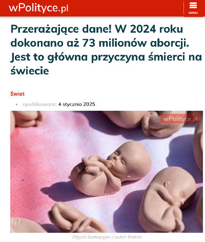 Kilka dni temu najpierw u jednego, a później u innego z fejsbukowych znajomych zobaczyłem screena z wPolityce.pl zgodnie z którym w 2024 roku na świecie wykonano 73 miliony aborcji, co było odpowiedzialne za aż 52% wszystkim zgonów.